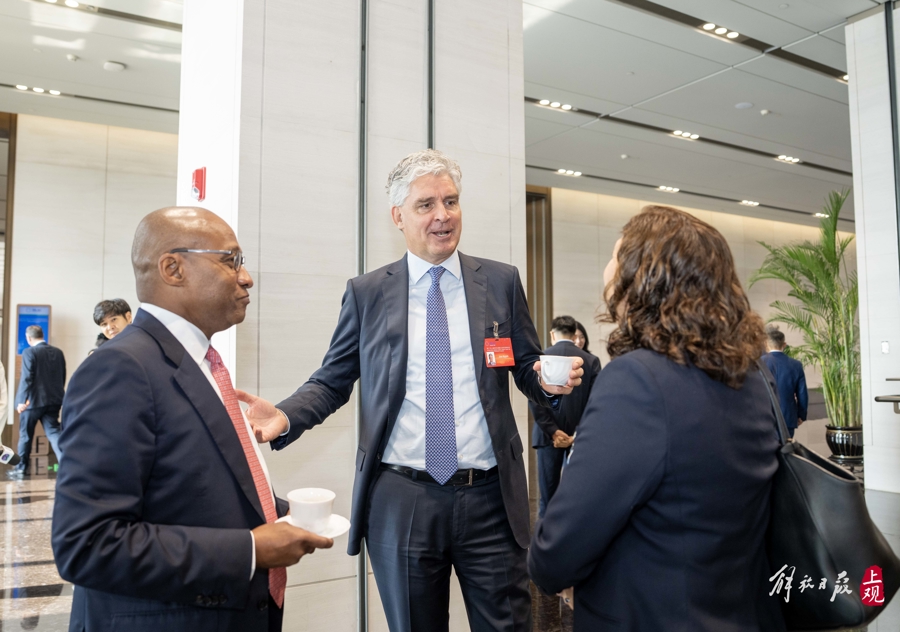 在本次市咨会前,国际企业家们应邀在西岸参观了一批上海AI企业。这些创立不久的企业凭借自身技术实力吸引了许多来宾的注意力。市咨会成员、安联集团董事会主席兼首席执行官奥利弗·贝特建议上海进一步开放金融体系,让国际资本能更便捷地支持技术领先的本土企业。