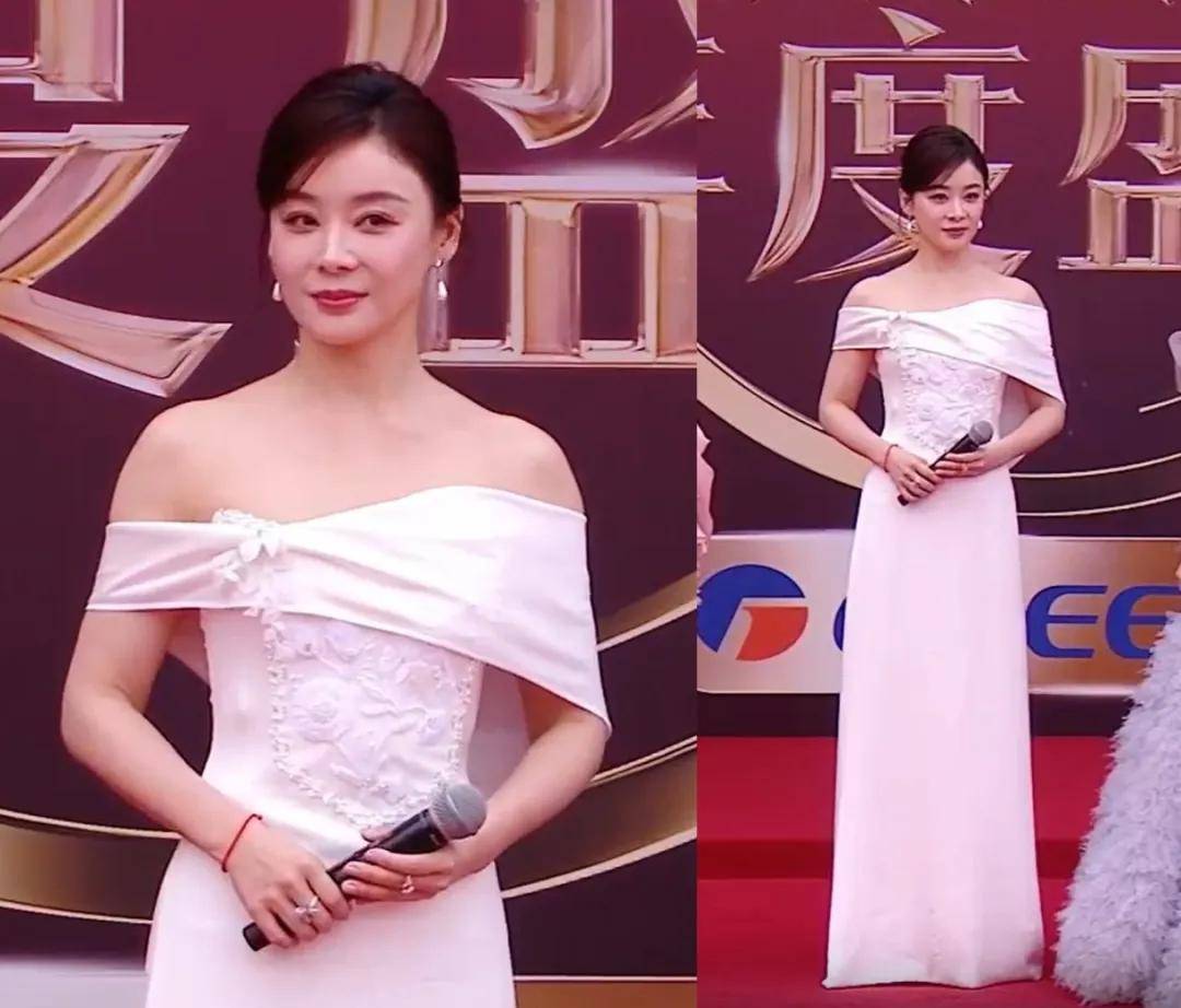 袁姗姗的脸虽然一度变得让人觉得陌生,但过了一段时间又变回观众熟悉的样子了。这次她穿了一条白色抹胸长裙,端庄优雅。