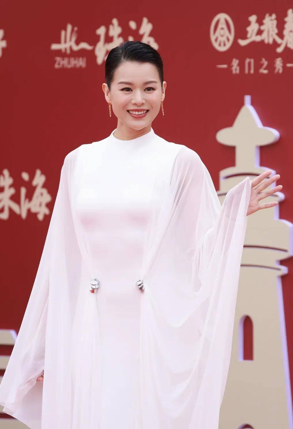 胡杏儿穿了一条白色纱裙,一头超短发让她在一众女明星中提高了辨识度,飒爽大气。