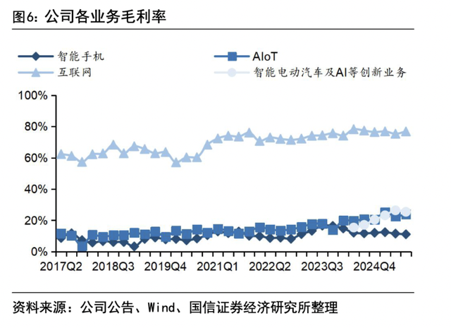 最后回过头来看一下小米的互联网业务,小米这家公司的神奇之处就在于,硬件虽然也能赚钱,但更多其实是赚流量,真正赚钱的业务其实是互联网,因为硬件的毛利就只有10%-25%,但互联网的毛利却能高达75%+,且不断呈上升趋势。2025Q3,互联网服务实现营收 94 亿元,同比增长 10.8%,创历史新高,营收虽不多,但就毛利润层面来看比手机好多了,待未来汽车广告等接入,与IOT与AI融合得更好,届时,小米的互联网业必成为公司的第一大利润来源。