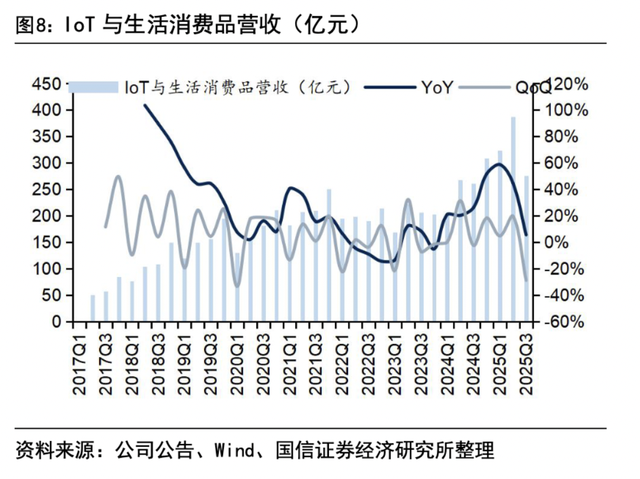 这也是小米的IOT能做得这么好、起势这么猛的核心原因,虽然2025Q3小米的AIoT营收275.5亿,同比+5.6%,大幅低于一季度的44.7%和二季度的58.7%,看起来增速有所放缓,但核心是因为国补退坡,Q3家电产品的收入回落得非常明显,在这样的大背景下,小米的IOT收入还能实现增长其实就已经很不错了。