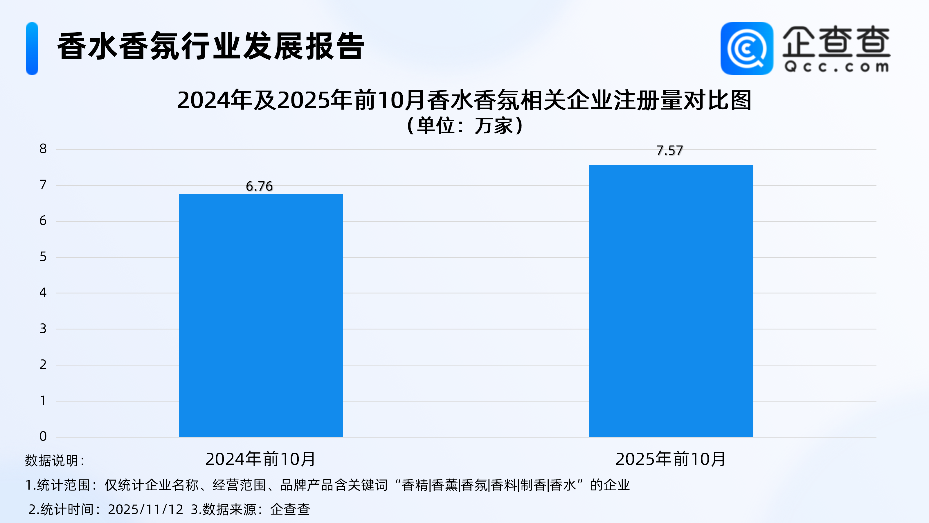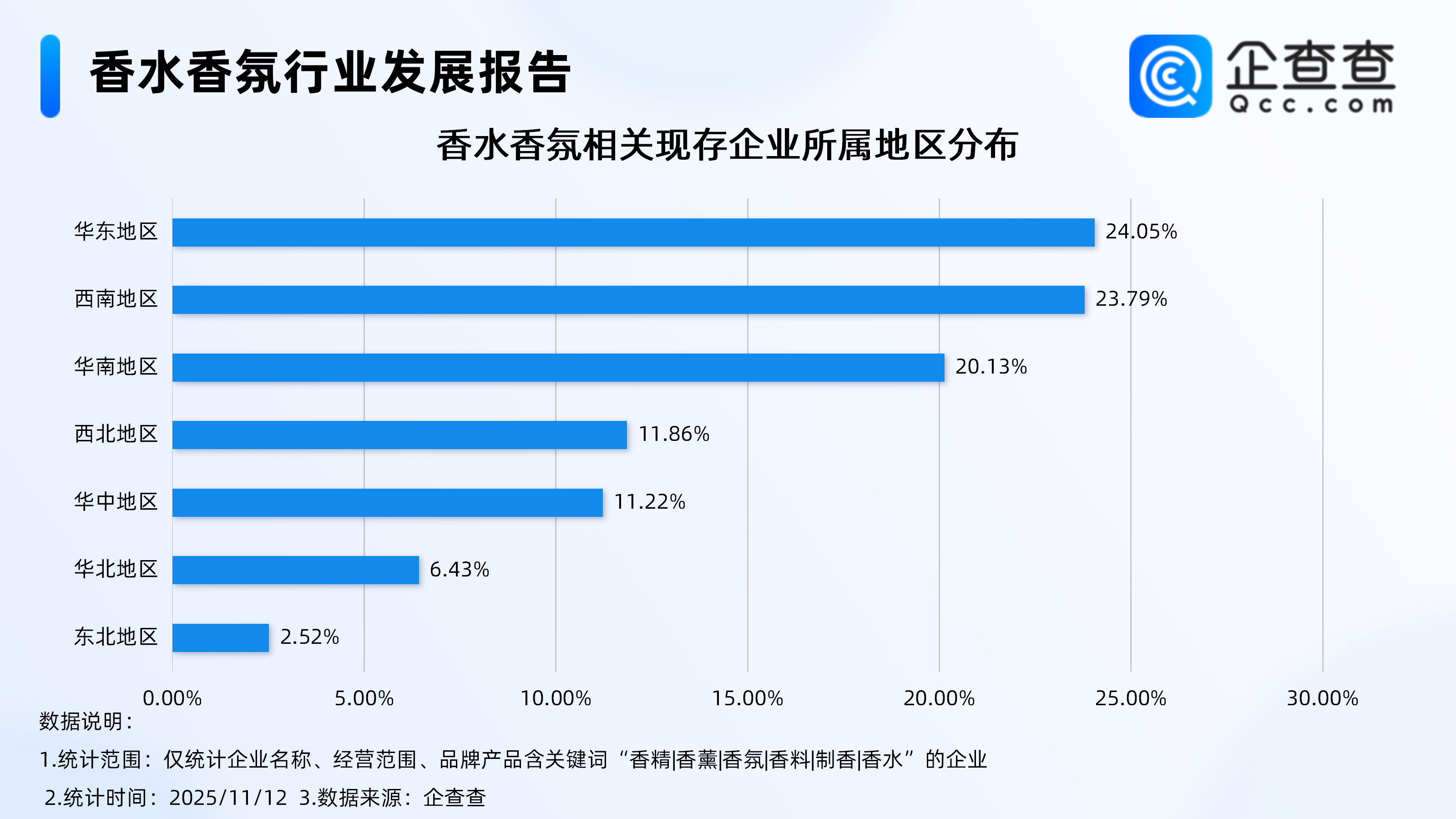 如今,快节奏的都市生活中,“情绪消费”成为一种新的消费方式。数据显示,超九成青年认可“情绪价值”,近六成青年愿意为情绪价值买单。其中香水具备较低的上手门槛和更广泛的应用场景,成为当代消费者追求情绪价值和自我体现的重要选择。伴随消费者对香水的认知度和接受度提升,中国香水渗透率和市场规模正稳步抬升。艾媒咨询数据显示,中国香水市场近5年平均增幅超20%,2024年市场规模达250亿,2025年有望突破300亿,预计到2029年突破500亿。企查查数据显示,截至11月12日,国内香水香氛相关企业现存量达40.83万家,主要分布在华东、西南地区,分别占比24.05%、23.79%。成立年限方面,超5成相关企业成立于近三年,其中成立年限在1-3年的相关企业最多,占比达36%。注册量方面,近十年国内香水香氛相关企业年注册量整体呈上升趋势,今年前10月注册量达7.57万家,同比增长11.99%。1、主要分布在华东、西南地区